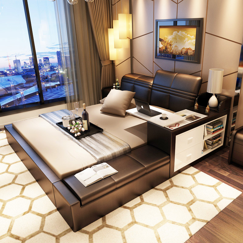 商品名称:创意真皮床双人床现代婚床1.8米1.5榻榻米床储物床皮艺床软床大床 床侧储物 升降靠背 双ll价格 更低